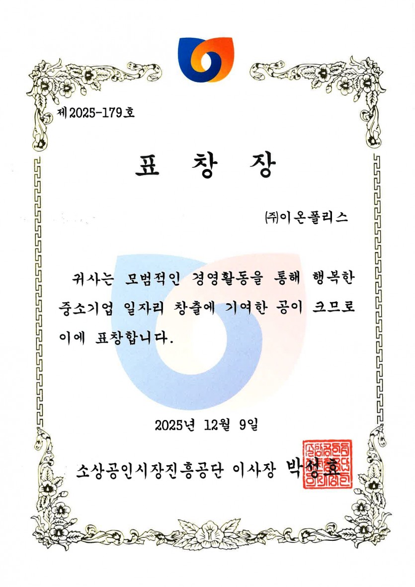 이온폴리스는 중소기업중앙회와 서울경제가 공동 주최한 ‘2025 행복한 중기 일자리 대상’에서 소상공인시장진흥공단 이사장 표창을 수상하였습니다.