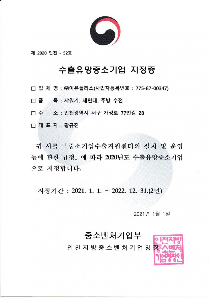 특허및인증서 수출유망중소기업 지정 페이지 정보 작성자 admin 댓글 0건 조회 951회 작성일 21-05-06 09:51 본문 수출유망중소기업 지정 목록 이전글품질우수제품 지정서 21.05.06 다음글장애인 표준사업장 인증서 21.01.06