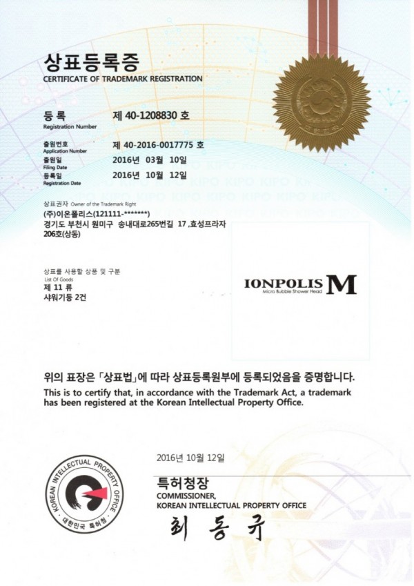 [특허 및 인증서] 상표등록증 ionpolis m