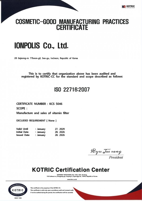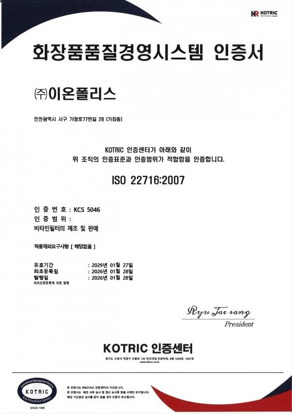 [특허 및 인증서] ISO 22716 화장품품질경영시스템 인증서