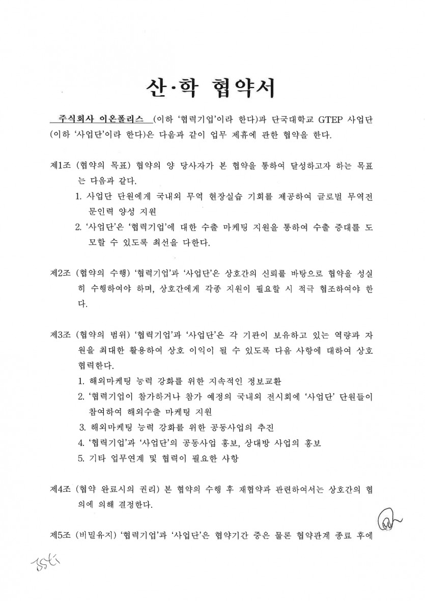 ㈜이온폴리스는 단국대학교 GTEP(Global Trade Expert Incubating Program) 사업단과 글로벌 무역 인재 양성과 해외시장 진출 확대를 위한 산학협력 협약을 체결했습니다.